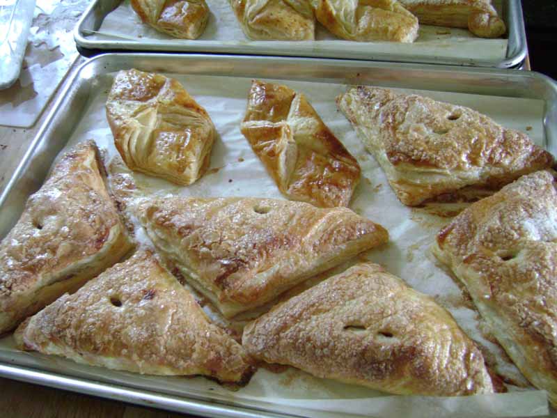 Blitz puff pastry turnovers and open pockets ready to be filled with jam. Note the light, golden crust.